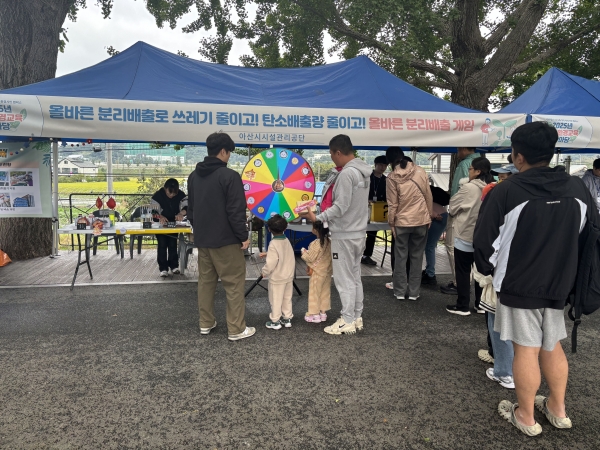 [충청25시] 아산시시설관리공단은 지난 17일 18일 양일간 곡교천 은행나무길에서 진행된 ‘2025년 아산 환경교육 한마당 행사’ 주관)에 참여해 ‘올바른 분리배출로 쓰레기 줄이고 탄소배출량 줄이고’라는 주제로 ‘올바른 분리배출 게임’ 부스를 운영했다.