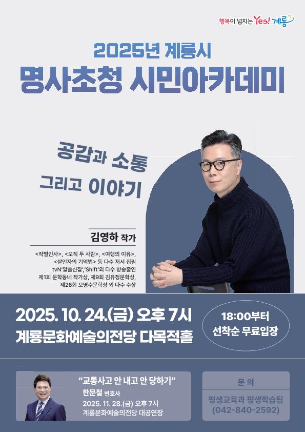한편 계룡시는 오는 11월 28일에 한문철 변호사를 초청해 ‘교통사고 안 내고 안 당하기’라는 주제로 두 번째 명사초청 시민아카데미를 개최할 예정이다.