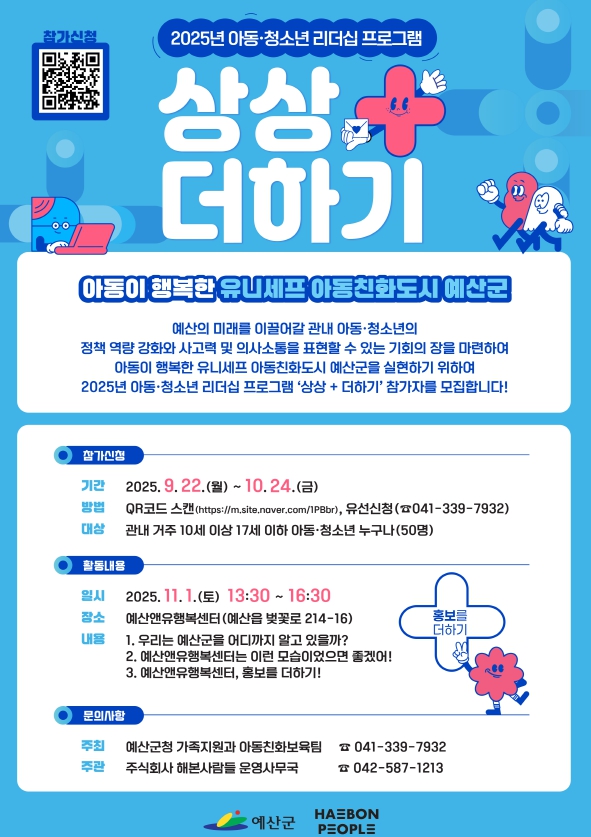 [충청25시] 예산군은 아동·청소년이 주체가 돼 아동친화도시 조성에 참여하는 ‘상상+더하기 아동·청소년 리더십 프로그램’의 참가자 모집기간을 기존 10월 17일에서 24일까지로 연장했다고 밝혔다.