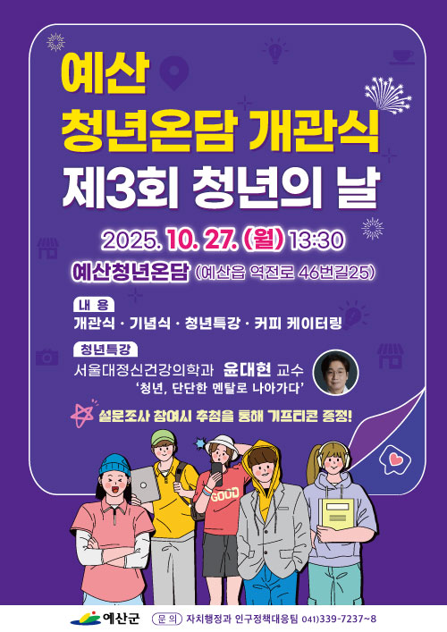 [충청25시] 예산군은 오는 10월 27일 오후 1시 30분, 예산읍 주교리에 위치한 청년거점공간 ‘예산청년온담’에서 개관식과 제3회 청년의 날 기념행사를 개최한다고 밝혔다.