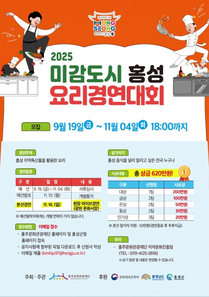‘2025년 미감도시 홍성 요리경연대회’ 참가자 추가 모집 관련 사항은 홍주문화관광재단 홈페이지에서 확인할 수 있으며 문의는 홍주문화관광재단 문화도시센터로 하면 된다.