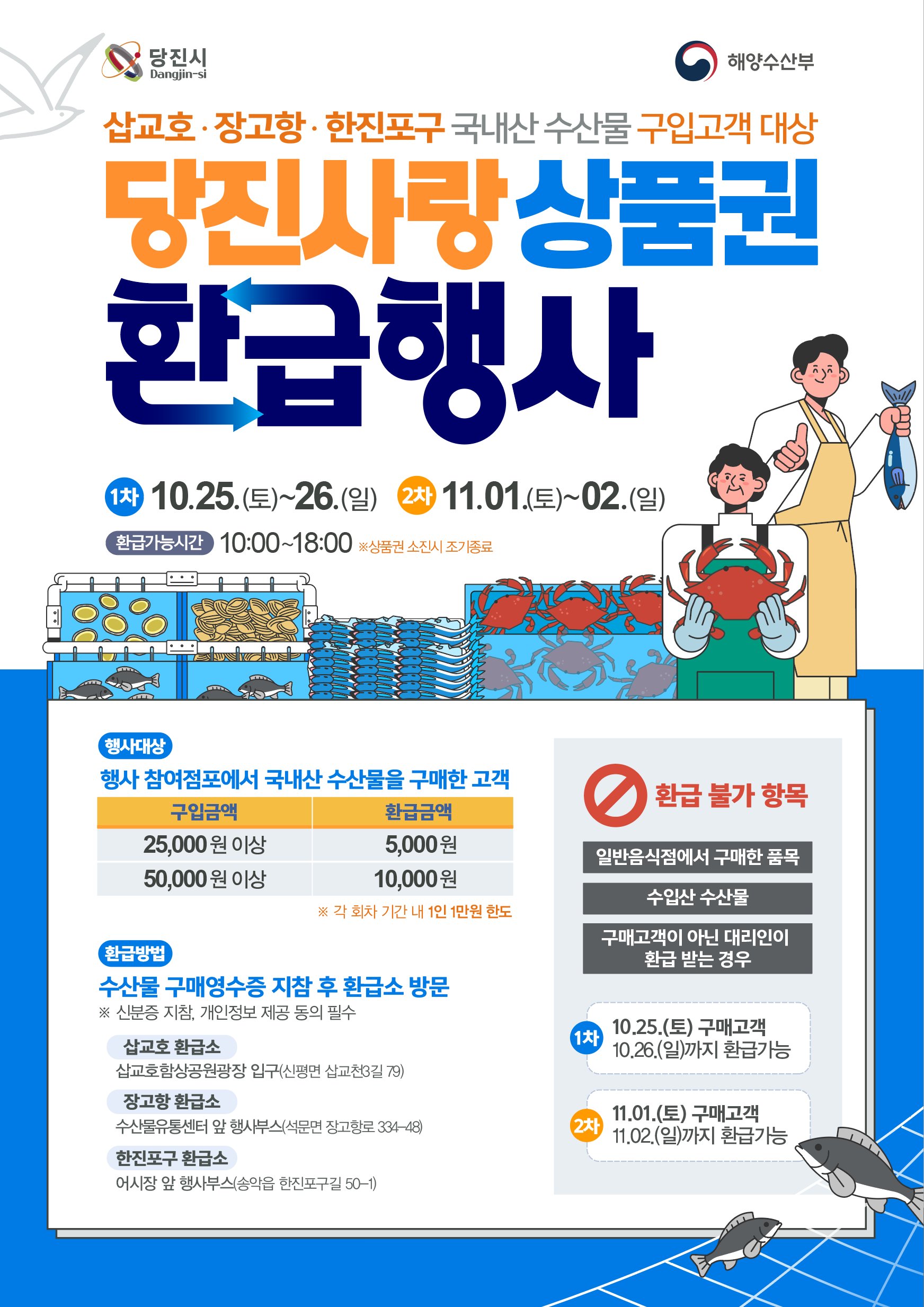 [충청25시] 당진시(시장 오성환)는 가을철을 맞아 오는 10월 25일과 26일 이틀간 국내산 수산물을 구매한 고객에게 최대 20%를 당진사랑상품권으로 환급하는 행사를 진행한다고 22일 밝혔다.