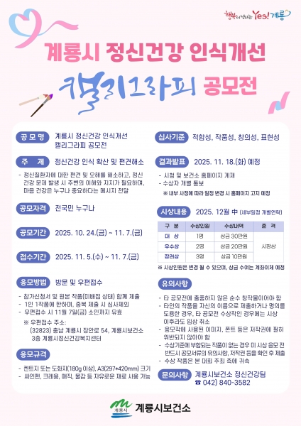 [충청25시] 계룡시는 정신건강 홍보주간을 맞아 시민이 직접 참여하는 ‘계룡시 정신건강 인식개선 캘리그라피 공모전’을 개최한다.