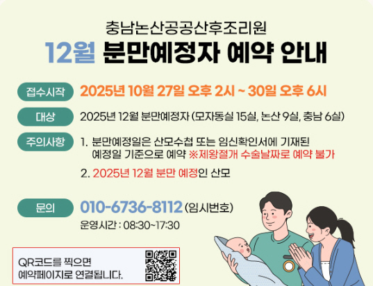 대상은 산모수첩, 임신확인서 예정일 기준 12월 분만 예정자로 신청은 충남논산공공산후조리원 홈페이지를 통해 온라인으로 진행된다.