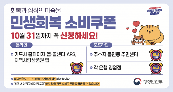 [충청25시] 행정안전부는 2차 민생회복 소비쿠폰의 온라인·오프라인 신청이 오는 10월 31일에 마감된다고 안내했다.