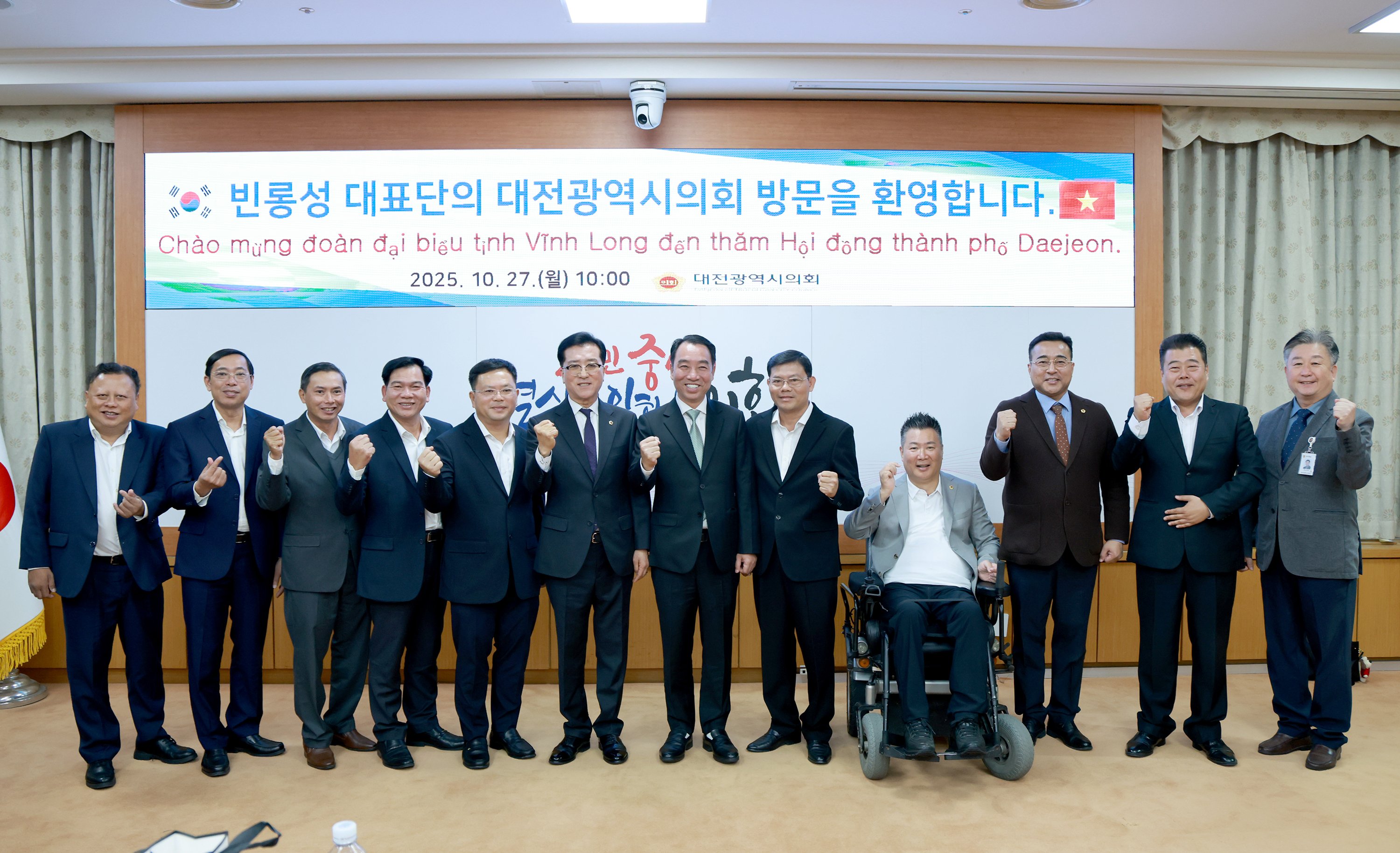 [충청25시] 대전시의회(의장 조원휘)는 베트남 빈롱성 인민위원회(위원장 르꽝응오이) 대표단이 27일 대전을 공식 방문해 대전시의회 및 대전시 주요 기관 관계자들과 교류 간담회를 가졌다고 밝혔다.