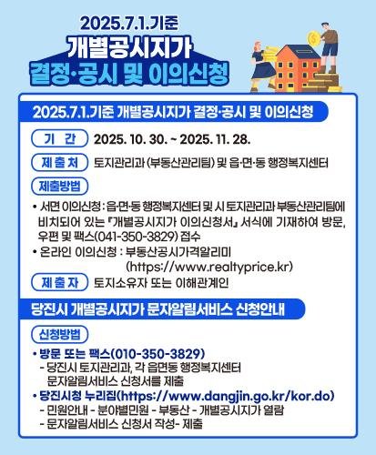 당진시 관계자는 “개별공시지가 결정·공시된 후 결정 통지문을 원하는 토지소유자는 토지관리과나 읍면동 행정복지센터에 방문하거나 당진시 누리집에서 ‘개별공시지가 결정통지문 온라인(문자알림) 서비스’를 신청해 매년 개별공시지가 결정·공시일에 맞춰 결정 통지문을 문자 또는 이메일로 받아볼 수 있다”고 전했다.