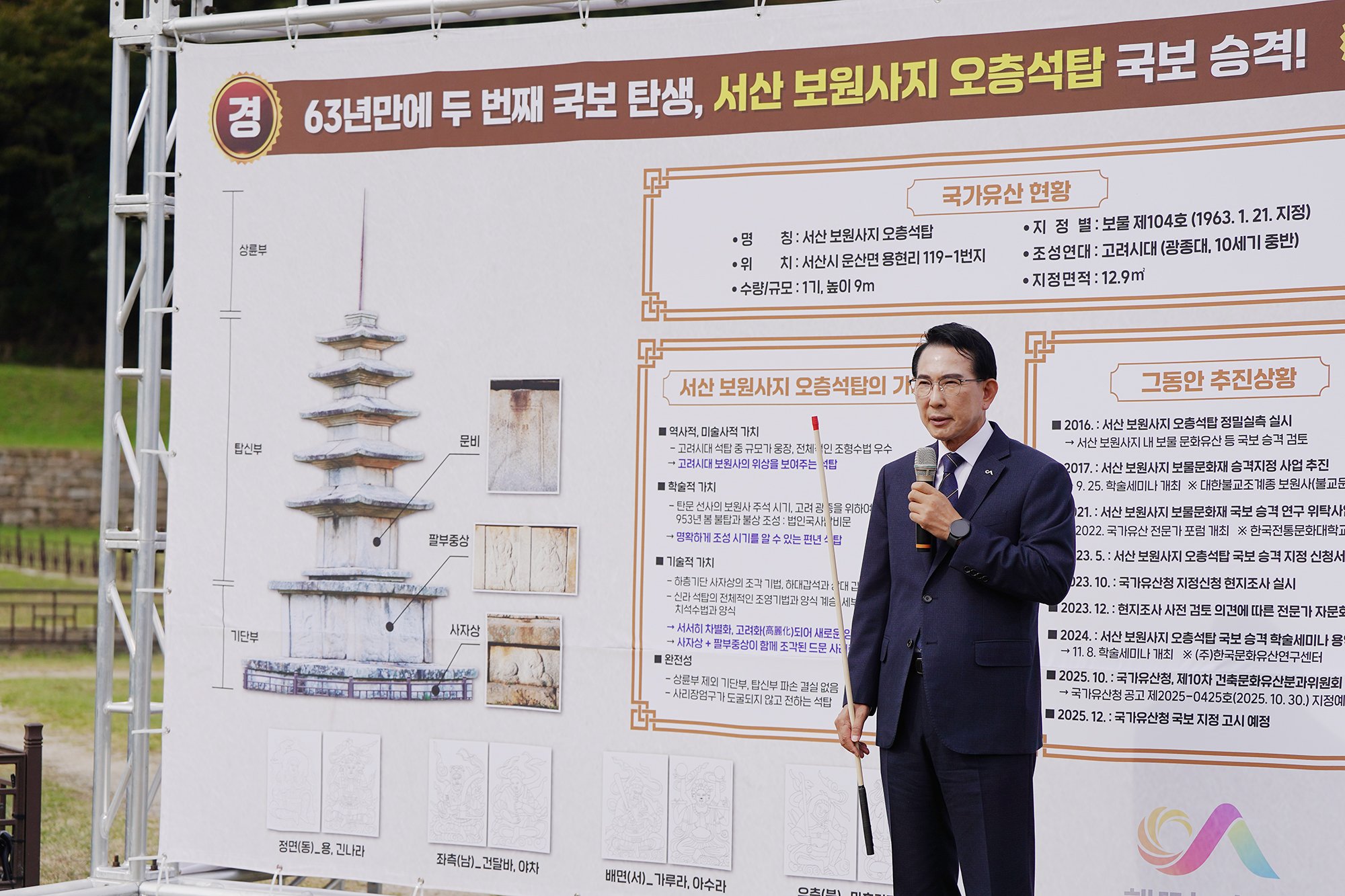 이완섭 서산시장은 30일 서산 보원사지 오층석탑 앞에서 기자회견을 열고 “63년 만에 우리 서산시에서 서산 보원사지 오층석탑의 국보 승격을 이뤄내며 두 번째 국보를 보유하게 됐다”고 말했다.