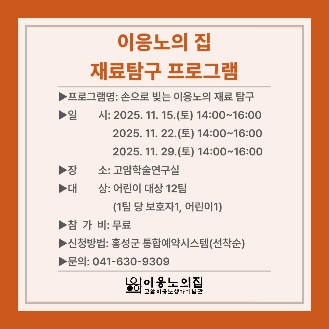 [충청25시] 홍성군 고암이응노생가기념관은 오는 15일 22일 29일 오후 2시부터 4시까지 ‘재료탐구 프로그램’을 운영한다고 밝혔다.