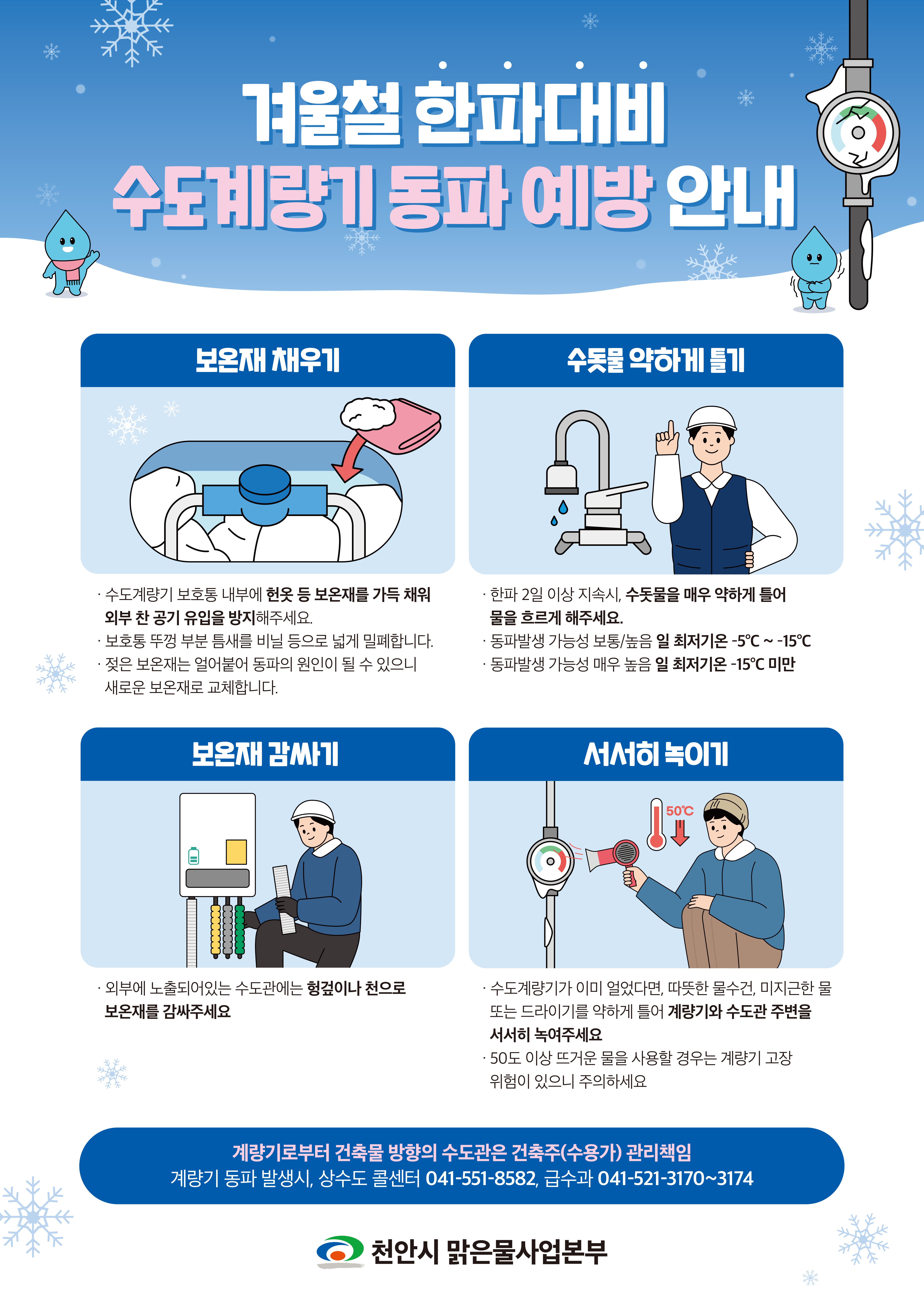 박종구 급수과장은 “다가오는 겨울철 한파와 대설에 대비해 수도시설 유지관리에 최선을 다할 것”이라며 “각 가정에서도 따뜻하고 안전한 겨울철을 보내기 위한 동파예방 활동에 적극적으로 참여해주시길 바란다”고 말했다.