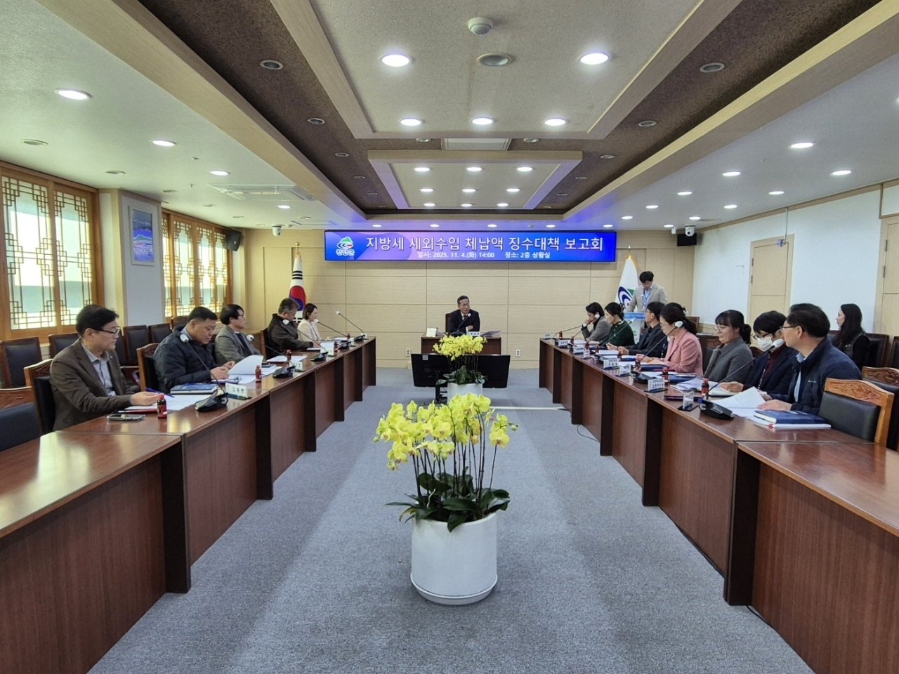 보고회는 윤여권 부군수 주재로 진행됐으며 청양읍 재무팀장, 4개 면 부면장, 본청 팀장 등 14명이 참석해 지방세와 세외수입 체납액 징수 실적 등 추진 사항을 점검하고 체납액 최소화를 위한 징수 방안에 대해 논의했다.