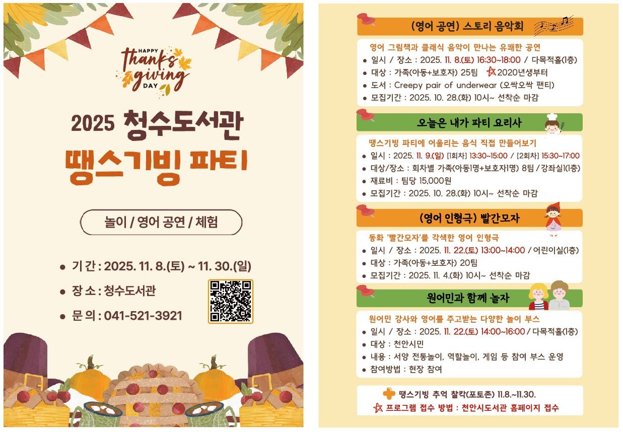 [충청25시] 천안시 청수도서관은 오는 8~ 30일 ‘2025 땡스기빙 파티’를 연다고 6일 밝혔다.