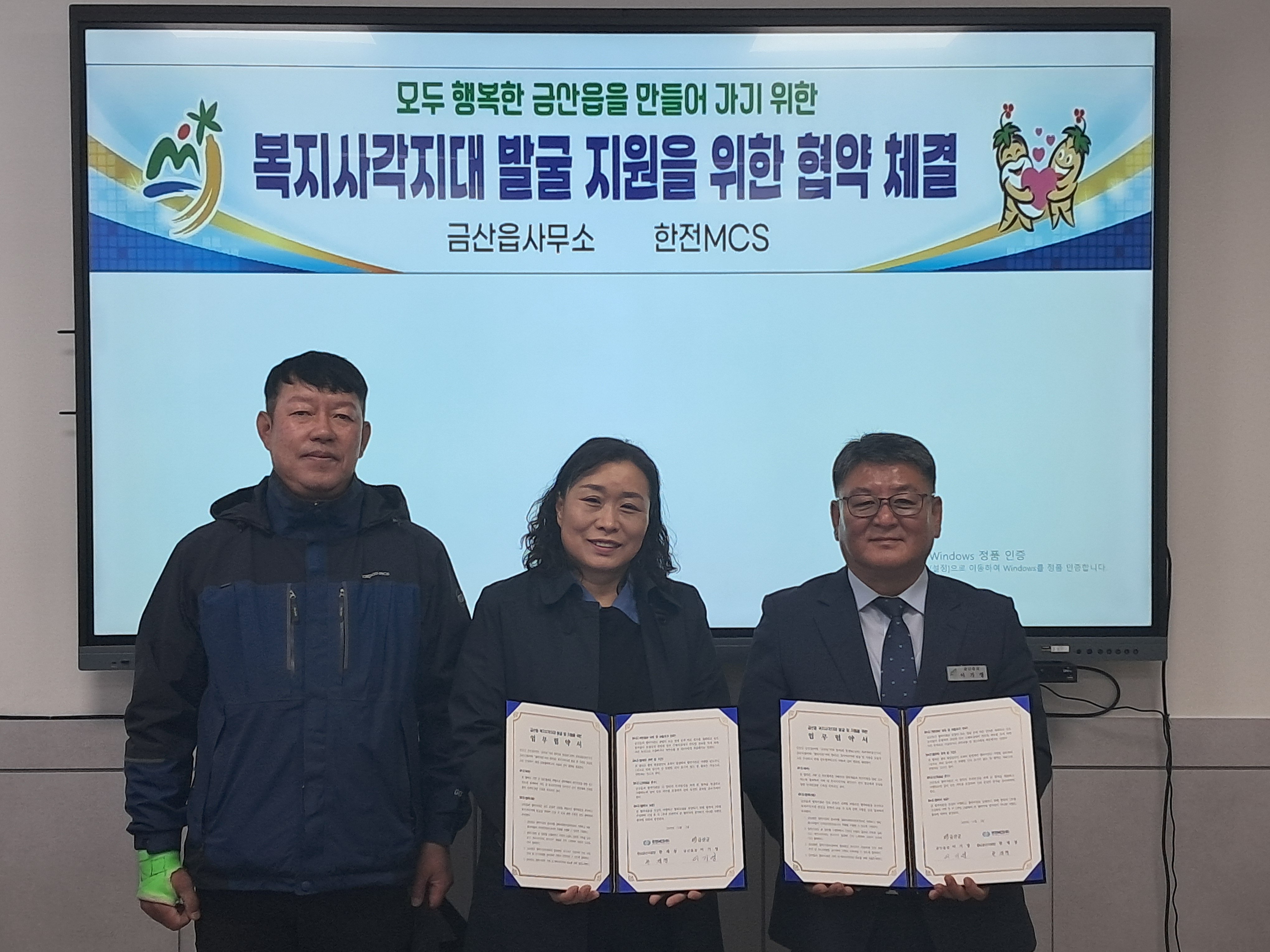 이날 협약식에 이기영 금산읍장과 한재경 한전엠씨에스 금산지점장 등이 참석해 복지사각지대를 함께 발굴하고 지원하기 위한 협력자원연계 및 네트워크 구축 등에 나서기로 했다.
