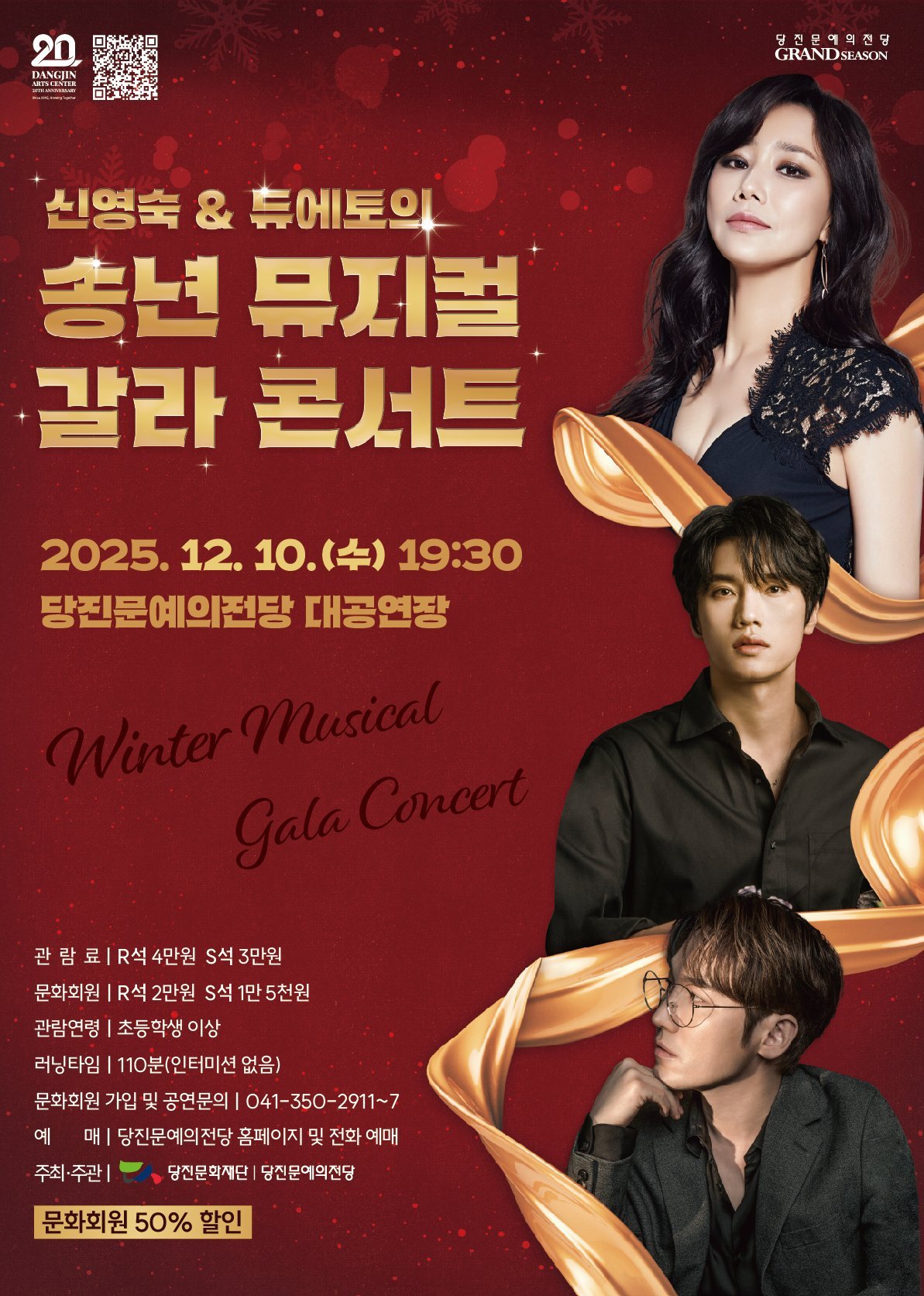[충청25시] 당진문화재단·당진문예의전당은 당진문예의전당 개관 20주년을 기념해 특별 기획공연 ‘신영숙 & 듀에토의 송년 뮤지컬 갈라 콘서트’를 오는 12월 10일 오후 7시 30분, 당진문예의전당 대공연장에서 선보인다.