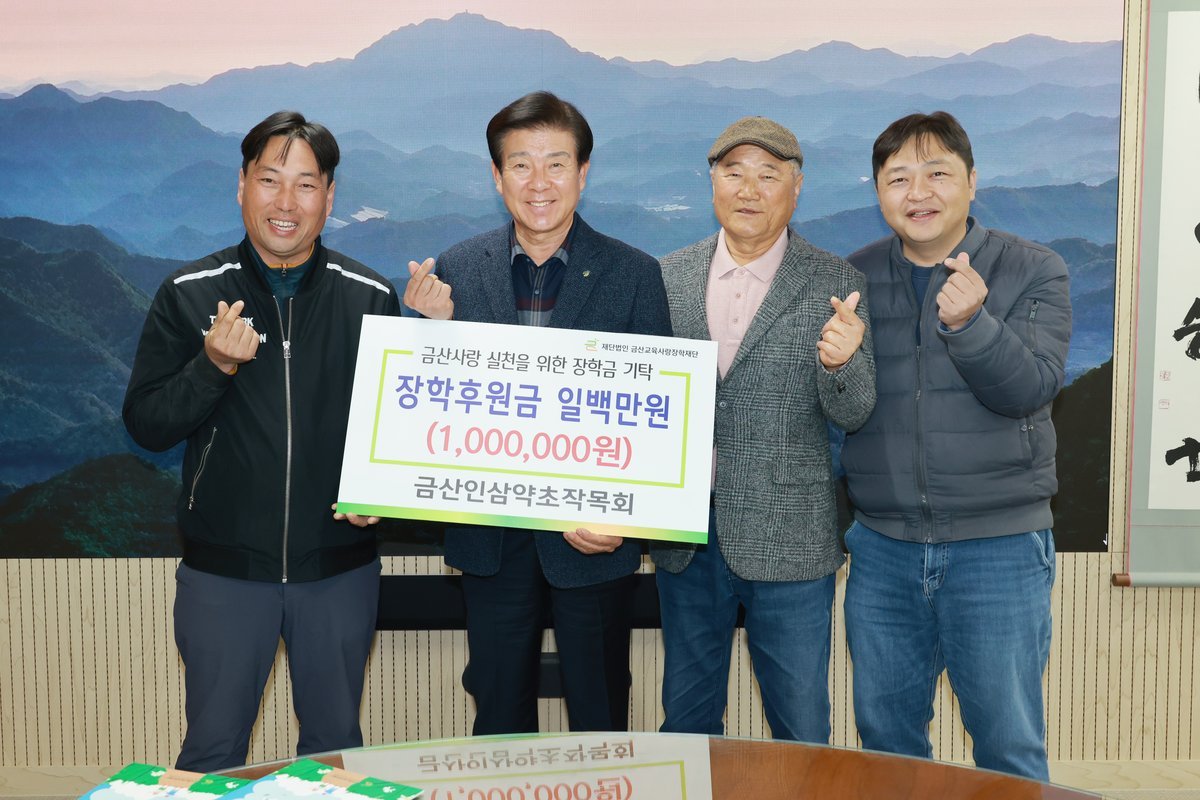 [충청25시] 금산인삼약초작목회는 지난 6일 금산군청에서 금산교육사랑장학재단에 장학금 100만원을 기탁했다.