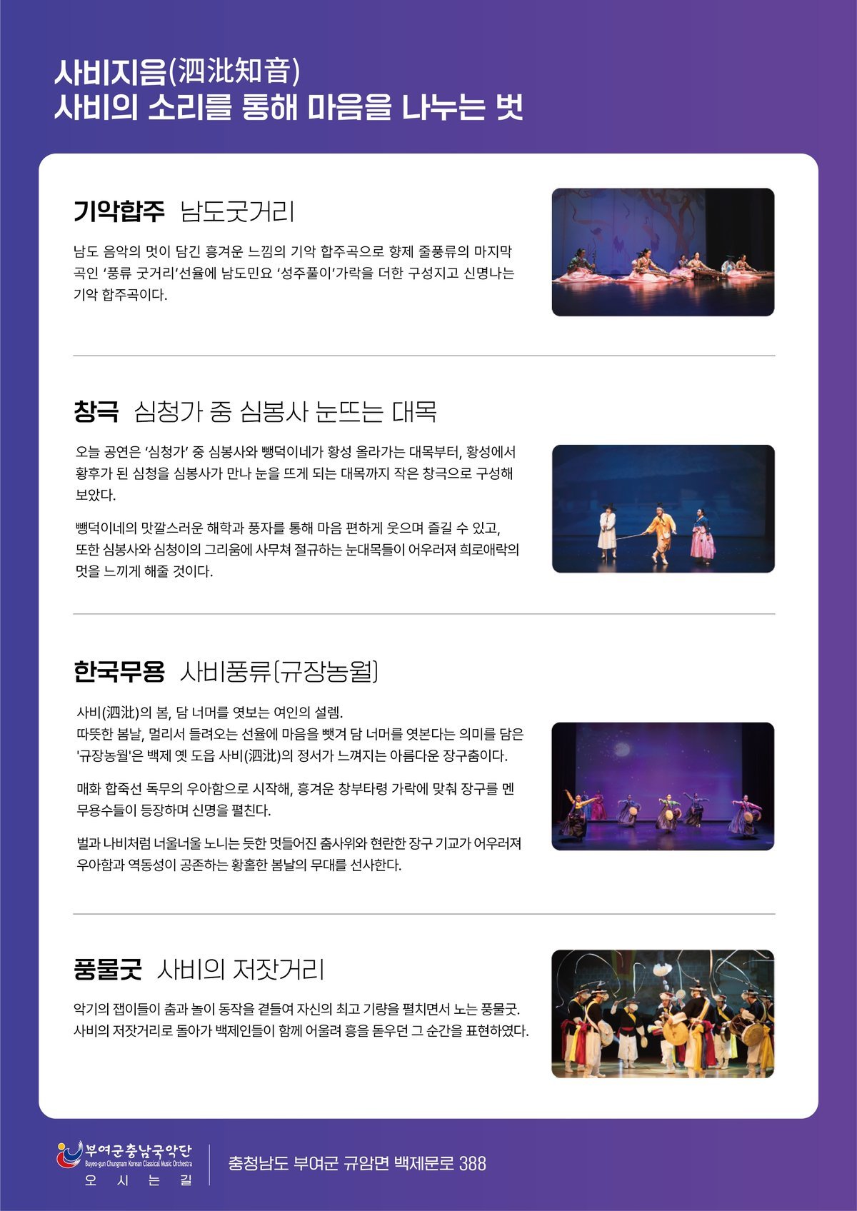 앞서 부여군충남국악단은 지난 제66회 정기 공연에서 국가무형유산 보유자들과 함께 완성도 높은 무대를 선보이며 관객들의 큰 호평을 받은 바 있다.