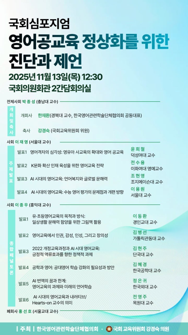 [충청25시] 2025.11.13.국회 교육위원회 소속인 강경숙 의원은 11월 13일 12시 30분, 국회의원회관 2간담회의실에서 ‘영어공교육 정상화와 미래 교육 방향 모색’을 주제로 국회 심포지엄을 개최했다.