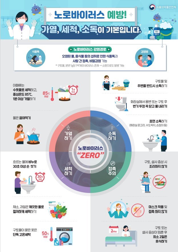 특히 음식점을 대상으로 △조리 전후 비누로 30초 이상 손 씻기 △굴, 조개 등 해산물은 반드시 익혀 먹기 △채소·과일은 깨끗한 물에 충분히 세척하기 △조리기구는 구분 사용 및 열탕 소독하기 등의 예방수칙을 안내하고 있다.