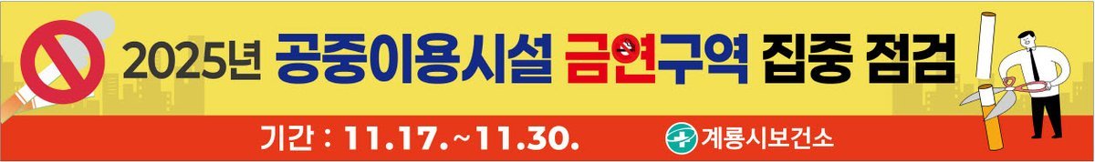 [충청25시] 계룡시는 시민의 건강 보호와 쾌적한 공공환경 조성을 위해 2025년 금연구역 합동점검을 11월 17일부터 11월 30일까지 2주간 실시한다고 밝혔다.