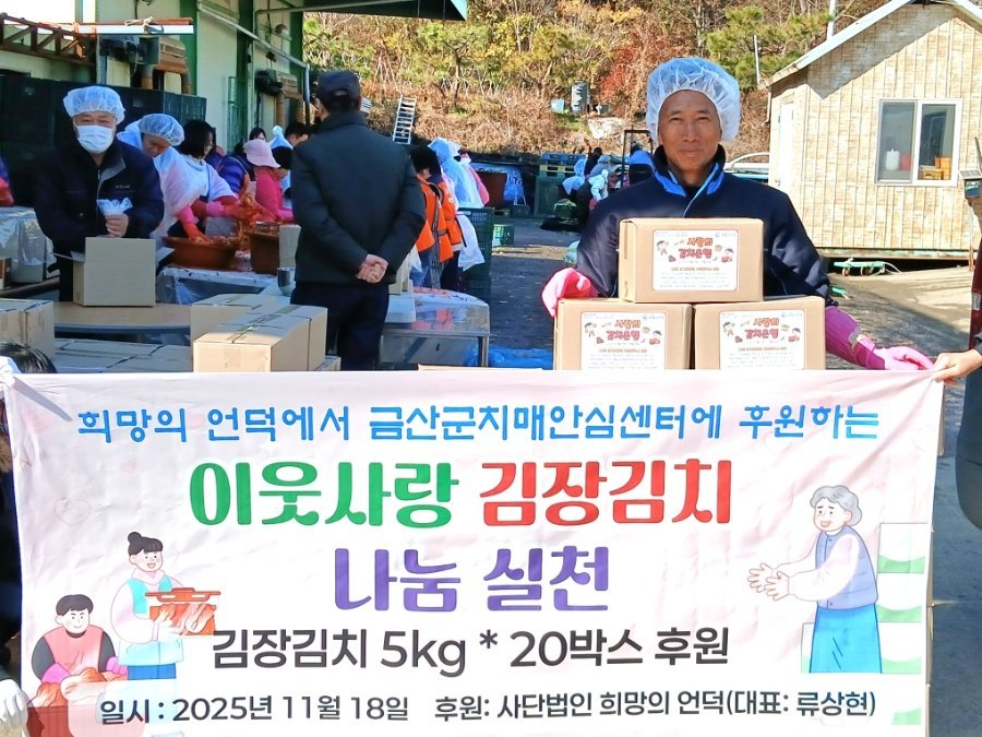 [충청25시] 지역봉사단체 희망의 언덕은 지난 18일 지역 내 취약계층을 위해 금산군치매안심센터에 김장김치 5kg 20상자 총 100kg을 기탁했다.