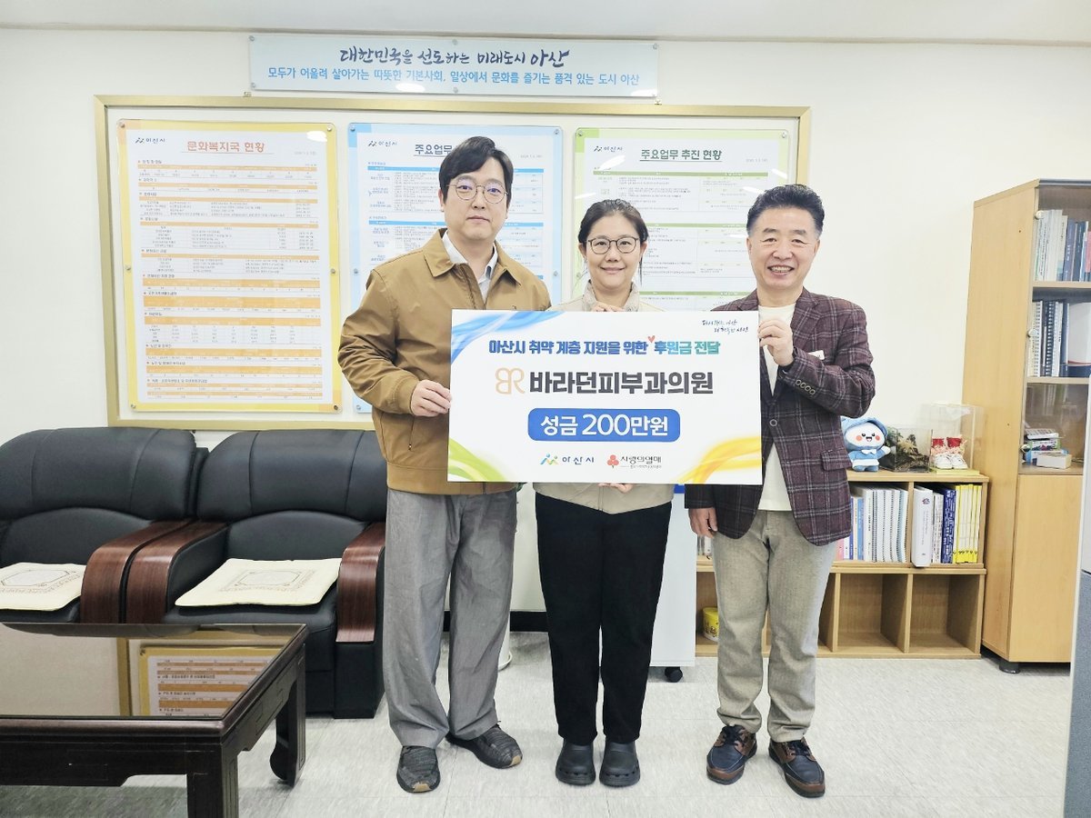 [충청25시] 아산시는 19일 바라던피부과의원이 지역 취약계층을 위해 200만원을 후원했다고 밝혔다.