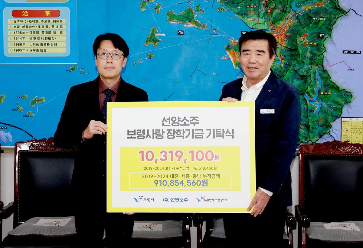 [충청25시] 보령시는 지난 20일 시장실에서 김동일 보령시장과 강재규 ㈜선양소주 영업본부장 등이 참석한 가운데 만세보령장학금 전달식을 가졌다고 밝혔다.