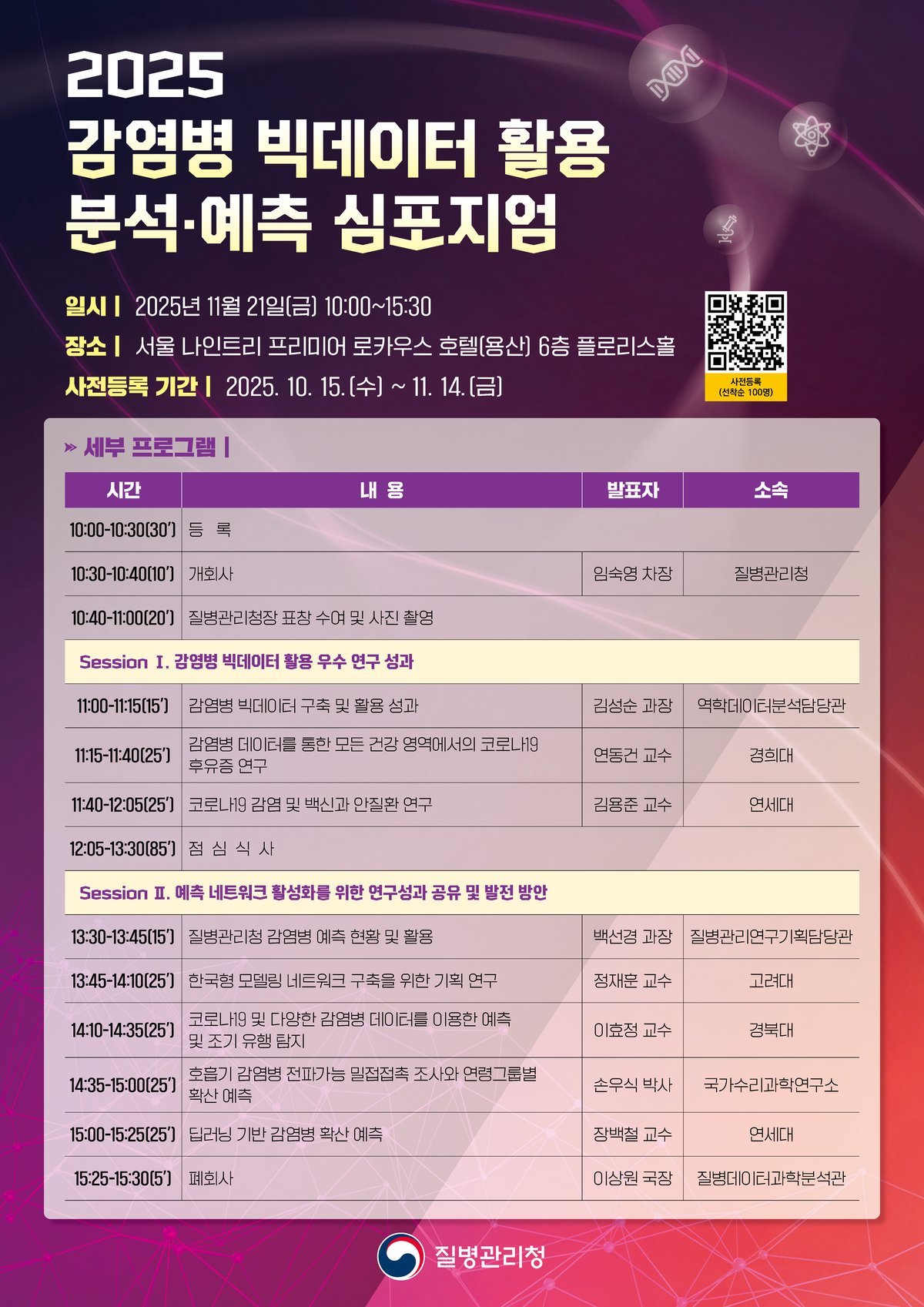 [충청25시] 질병관리청은 11월 21일 「2025 감염병 빅데이터 활용 분석·예측 심포지엄」을 개최하고, 연구성과를 공유하며 향후 데이터 기반 정책 고도화 방안을 논의한다.