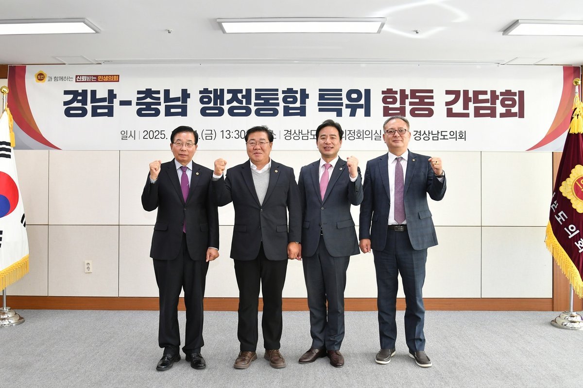 [충청25시] 충남도의회 ‘충남대전 행정통합 특별위원회’는 21일 경상남도의회를 방문해 ‘부산경남 행정통합 특별위원회’와 합동 간담회를 갖고, 행정통합추진 전략과 초광역 협력 확대 방안을 논의했다.