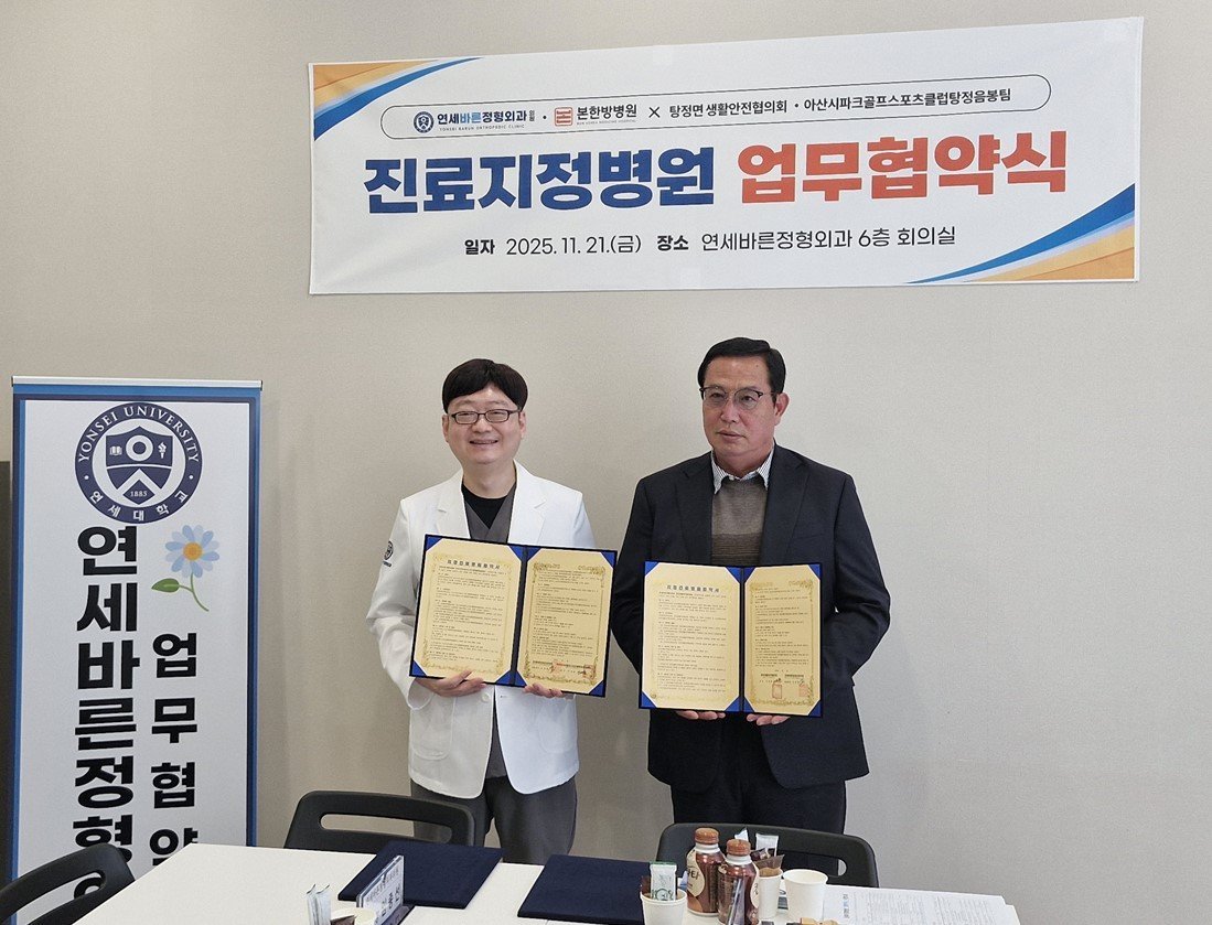 [충청25시] 탕정면 생활안전협의회와 아산시파크골프스포츠클럽은 지난 21일 연세바른정형외과와 지역주민의 건강 증진과 의료서비스 향상을 위한 진료지정병원 업무협약을 체결했다.