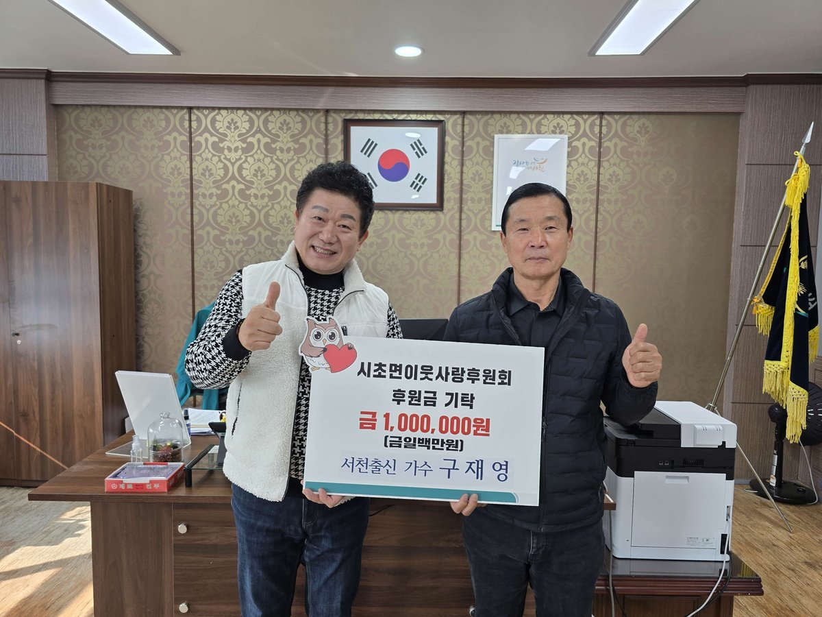 [충청25시] 서천군 시초면 출신 가수 구재영 씨가 지역의 취약계층을 돕기 위해 시초면이웃사랑후원회에 후원금 100만원을 기탁했다.