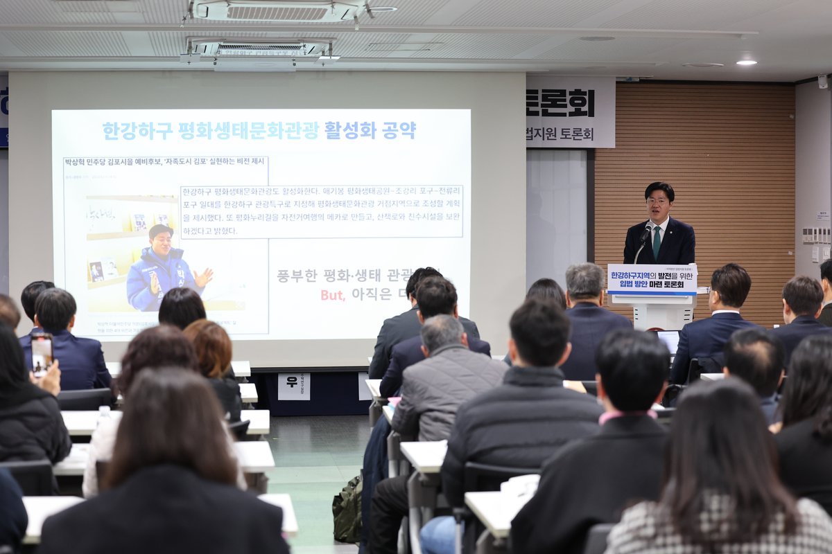 직접 주제발표에 나선 박상혁 의원은 “한강하구 지역은 시암리 습지, 김포한강야생조류생태공원 등 생태계 다양성이 잘 보존되어 왔고, 애기봉 평화생태공원, 전류리 포구, 한강을 따라 뻗은 평화누리자전거길 등 많은 관광자원이 있음에도 불구하고 지리적·군사적 특성으로 각종 규제를 중첩 적용받아 발전이 더뎌왔다”며, “한강하구지역의 발전을 위해 이제는 중앙정부의 적극적 역할이 반드시 필요하기에, 국가적 차원의 지원 근거를 만들기 위해 「한강하구법」입안을 준비하게 되었다”고 입법의 필요성을 설명하였다.