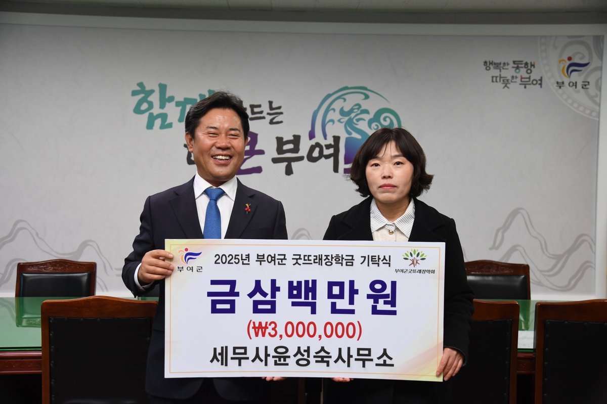 [충청25시] 세무사윤성숙사무소는 지난 3일 부여군청을 방문하여 인재 육성을 위한 장학금 3백만 원을 부여군굿뜨래장학회에 기탁하였다.