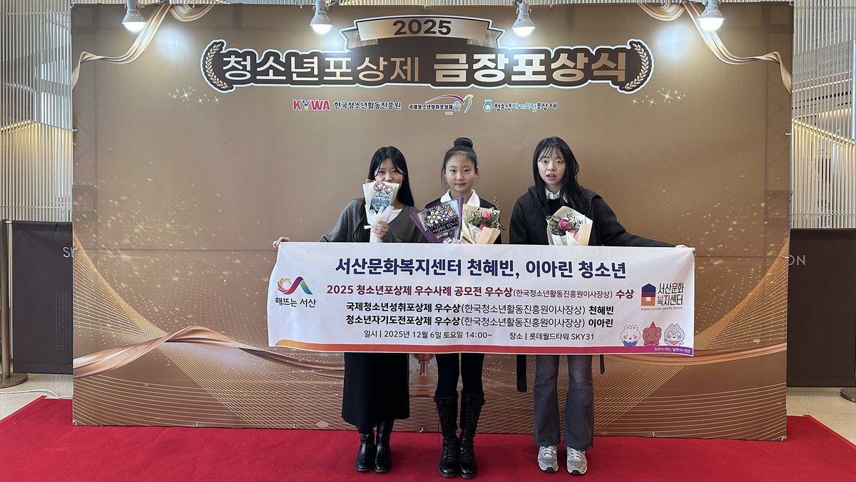 [충청25시] 2025년 서산문화복지센터 청소년포상제의 빛났던 노력의 결과 -서산문화복지센터 청소년수련관은 지난 12월 6일 롯데월드타워 SKY31컨벤션에서 열린 ‘2025년 청소년포상제 금장 포상식’에서 센터 소속 청소년 2명이 우수사례 공모전 우수상을 수상했다고 밝혔다.