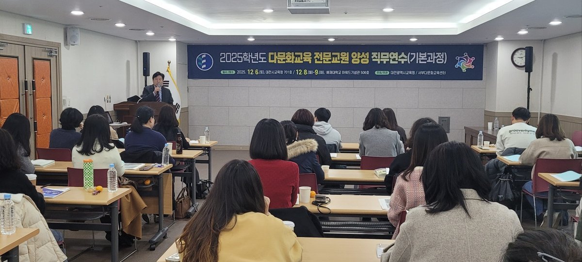[충청25시] 대전시교육청은 12월 6일부터 9일까지 3일 동안 본관 701회 희의실 및 배재대학교 하워드기념관에서 유·초·중·고 교원 39명을 대상으로‘다문화교육 전문교원 양성 직무연수’를 운영했다고 밝혔다.