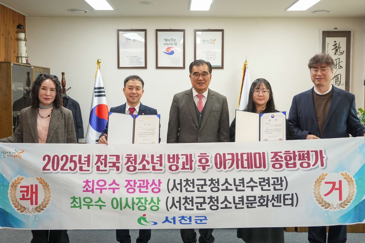 [충청25시] 서천군이 운영하는 서천군청소년수련관과 서천군청소년문화센터가 지난달 28일 성평등가족부와 한국청소년진흥원이 실시한 2025년 전국 청소년 방과후 아카데미 종합평가에서 나란히 최우수상을 수상했다.