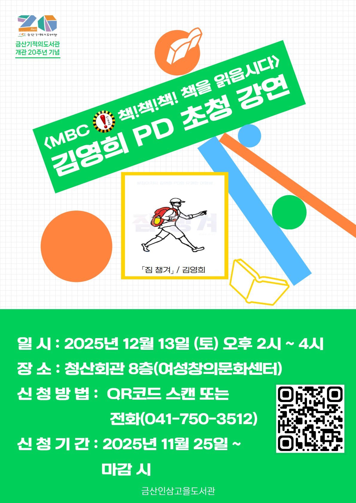 [충청25시] 금산기적의도서관은 올해 개관 20주년을 기념해 오는 13일 오후 2시 금산읍 청산회관에서 김영희 작가 초청 강연을 개최한다.