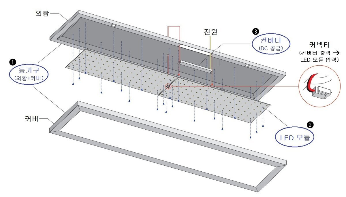 제정안 3종은 주요 부품인 ➊등기구, ➋LED 모듈, ➌컨버터로 구성되어 있다. 제정안에서는 이들 부품의 개별 교체가 가능하도록 부품의 크기, 고정홀의 위치 및 나사의 크기를 통일하였다. 추가로, LED 모듈과 컨버터의 경우 전기적 호환성 확보를 위해 입‧출력 전류, 접속단자의 크기‧극성 등을 규정하였다.