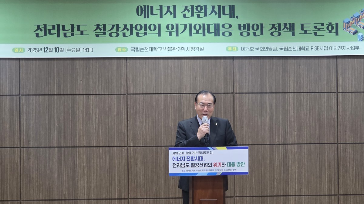 [충청25시] 이개호 국회의원실과 국립순천대학교는 10일 국립순천대 박물관 대회의실에서「에너지 전환시대, 전라남도 철강산업의 위기와 대응 방안」을 주제로 정책토론회를 공동 개최하고, 급변하는 산업환경 속에서 광양만권 철강산업이 나아가야 할 방향을 논의했다.