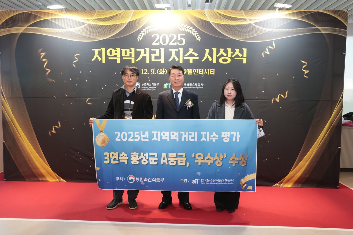 [충청25시] 충남 홍성군은 지난 9일 농림축산식품부가 주최하고, 한국농수산식품유통공사에서 주관하는 ‘2025년 지역먹거리 지수 평가’에서 3년 연속 A등급을 달성, “우수상”을 수상하며 지역먹거리 정책 우수 지자체로서의 위상을 굳건히 했다고 밝혔다.
