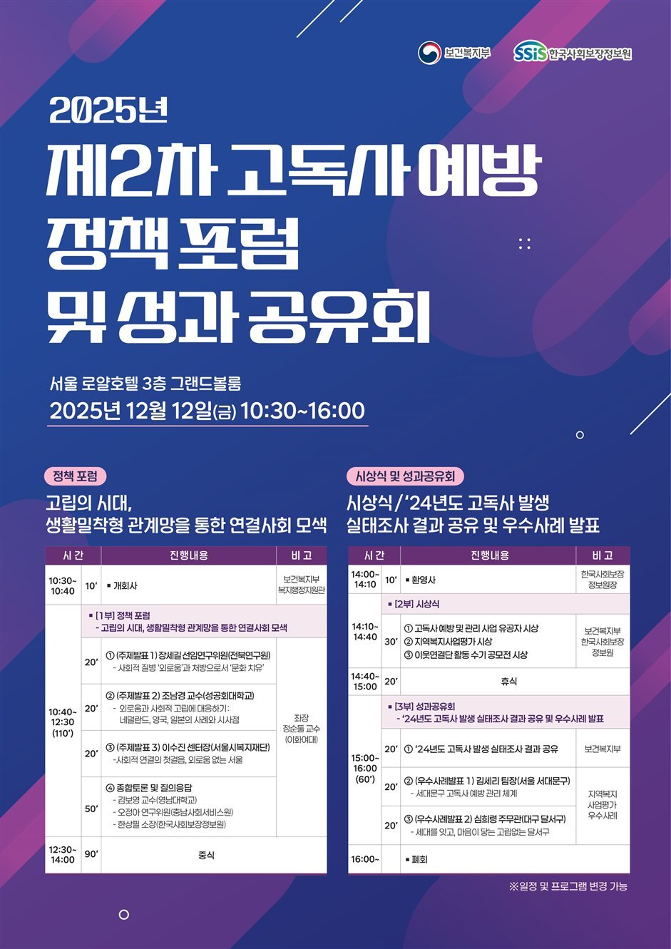 [충청25시] 보건복지부와 한국사회보장정보원은 12월 12일 오전 10시 30분에 로얄호텔에서「고독사 예방 정책 포럼 및 성과공유회」를 개최하여 사회적 고립 해소를 위한 현장 중심의 선제적인 예방 전략을 모색하고, 고독사 예방에 기여한 유공자를 시상하고 우수사례를 공유하였다.