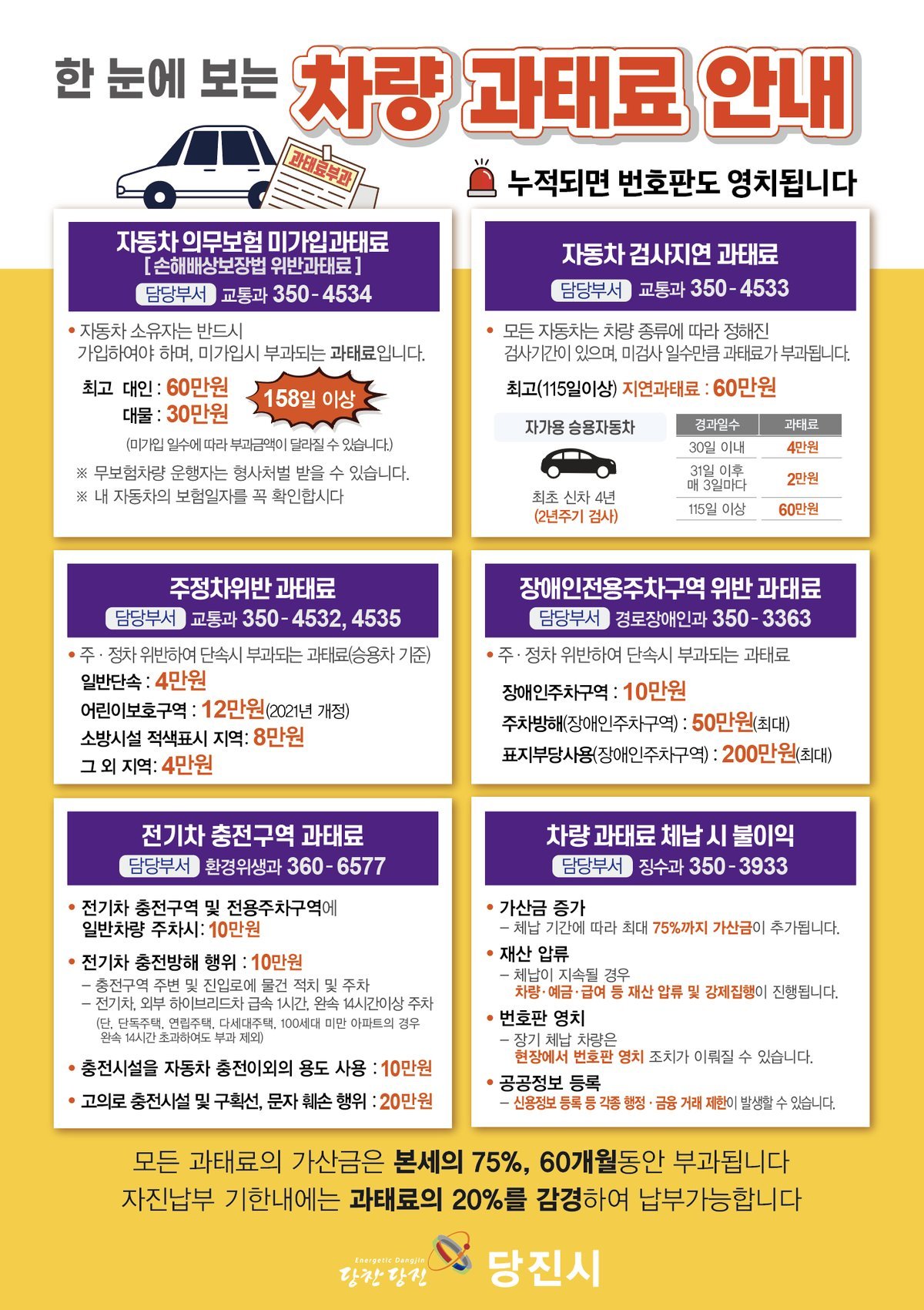 [충청25시] 당진시는 차량 관련 과태료 정보를 한눈에 확인할 수 있는‘차량 과태료 통합 안내문’을 제작해 관내 아파트 단지와 각 행정복지센터에 비치했다고 15일 밝혔다.