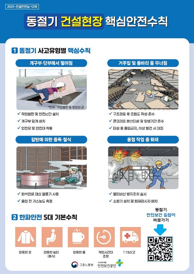 한파로 인한 안전사고를 예방하기 위해서는 따뜻한 옷·물, 쉼터, 작업시간대 조정, 119 신고 등 5대 기본수칙을 준수하는 게 중요하다.