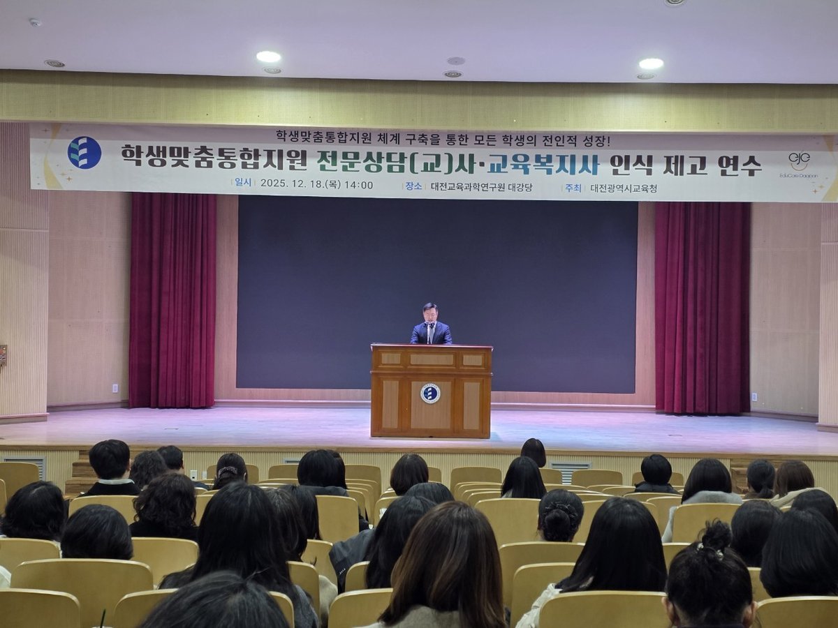 [충청25시] 대전교육청과 서부교육지원청은 12월 18일 대전교육과학연구원 대강당에서 초․중․고 전문상담교사, 전문상담사, 교육복지사 250여 명을 대상으로 학생맞춤통합지원 인식 제고 연수를 실시했다고 밝혔다.