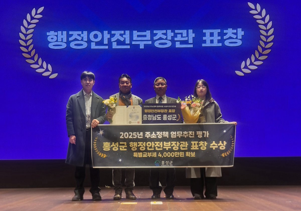 [충청25시] 충청남도 홍성군이 지난 18일 행정안전부 주관 ‘2025년 주소정책 업무추진’평가에서 2010년, 2015년, 2018년에 이어 2025년에도 우수기관으로 선정되며 지역사회의 도로명주소 활용 및 관리 역량을 한 단계 끌어올린 성과를 인정받아 행정안전부 장관 표창과 특별교부세 4000만원을 받았다고 밝혔다.