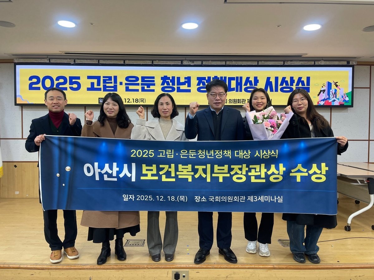 [충청25시] 아산시는 18일 국회에서 열린 ‘2025 고립·은둔 청년정책 대상’시상식에서 보건복지부장관상을 수상했다고 밝혔다.