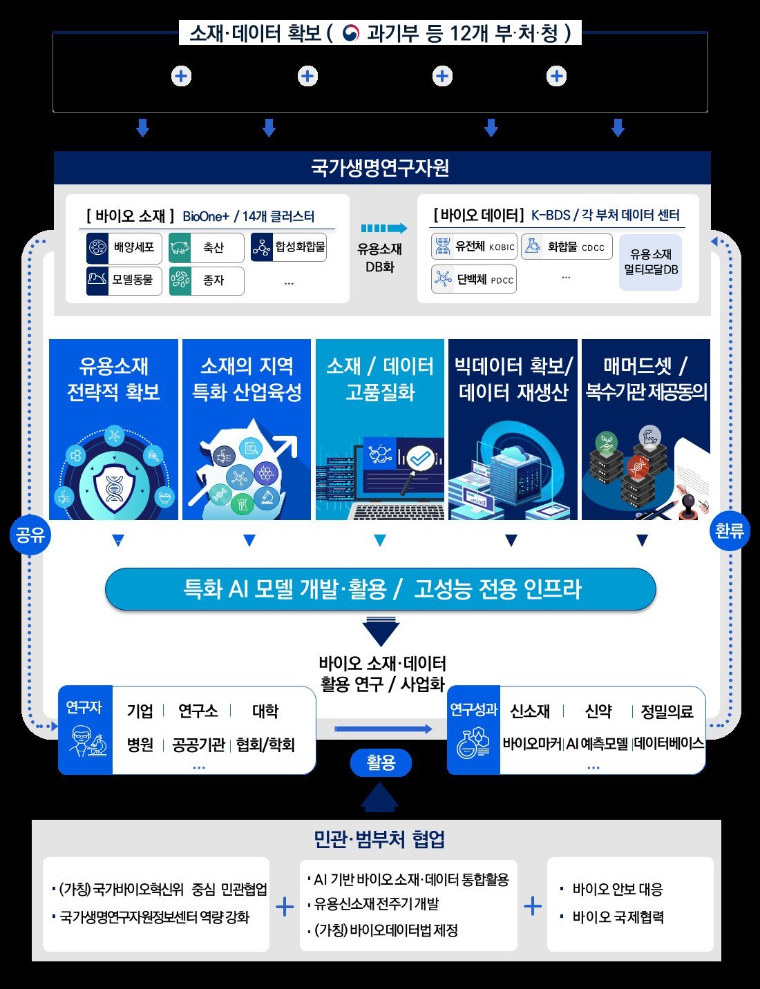 세 번째로 AI 바이오 혁신을 지원하는 민관협력 체계를 공고화하기 위해 민․관 범부처 바이오 데이터 협업 체계를 재편하고 국가생명연구자원정보센터의 위상 및 기능을 강화한다. 바이오 연구·산업을 진흥하고 안전하게 의료 데이터를 활용하기 위한 법률적 기반을 마련*하고, 의료 데이터 활용 편의를 제고하기 위한 제도 개선도 병행 추진한다. 아울러 민․관 협력으로 감염병 등의 다기관 및 디지털 기반 위기 대응체계를 강화하고 범부처 글로벌 협력을 지속 확대할 계획이다.