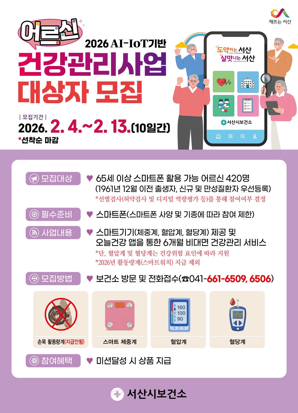 [충청25시] 충남 서산시가 인공지능·사물인터넷 기반 어르신 건강관리사업의 대상자를 모집한다고 밝혔다.