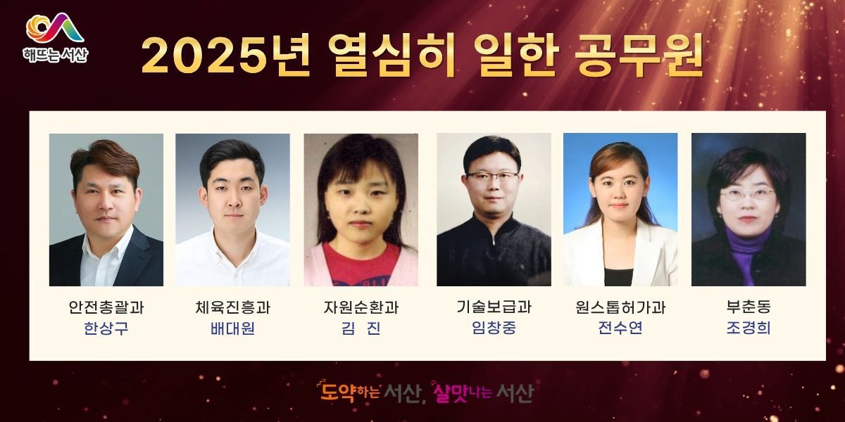 [충청25시] 충남 서산시는 올해 시정 발전과 시민 삶의 질 향상을 위해 노력한 공무원 6명을 ‘열심히 일한 공무원’으로 선정했다고 밝혔다.