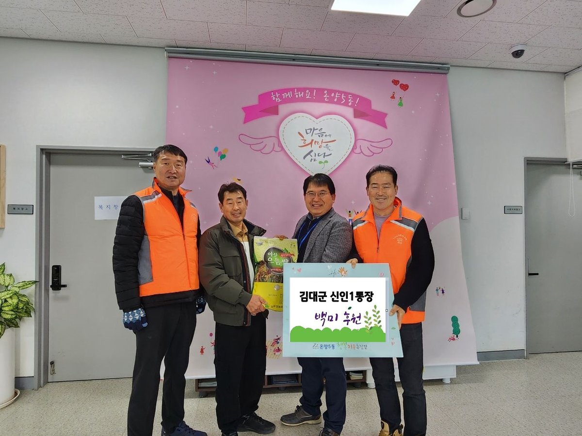 김경일 온양5동장은 “김대군 통장님께서는 평소에도 지역과 이웃을 위해 헌신해 오신 분”이라며 “기부해 주신 소중한 쌀은 도움이 필요한 이웃들에게 잘 전달될 수 있도록 하겠다”고 감사의 뜻을 전했다.