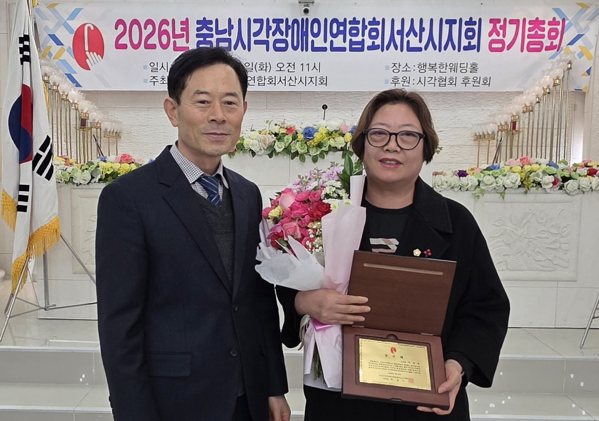 [충청25시] 서산시의회 가선숙 의원이 1월 20일 열린 '2026년 충남시각장애인연합회 서산시지회 정기총회'에서 공로패를 받았다.